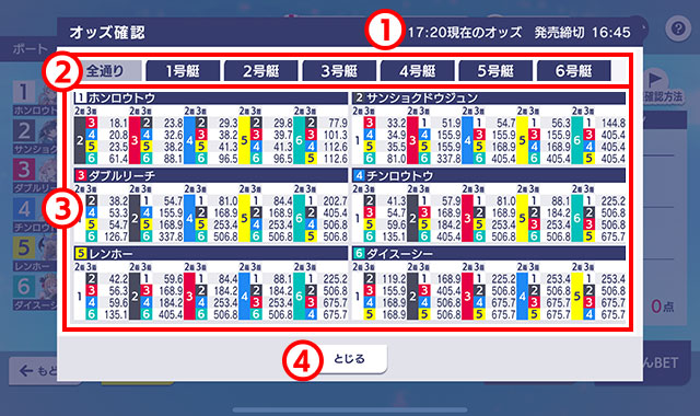 - 全通りの組み合わせと、各艇を1着とした組み合わせ、それぞれのオッズを確認できます。