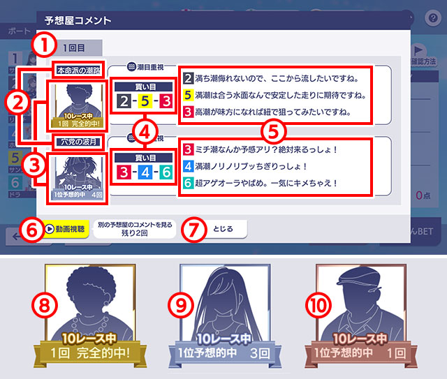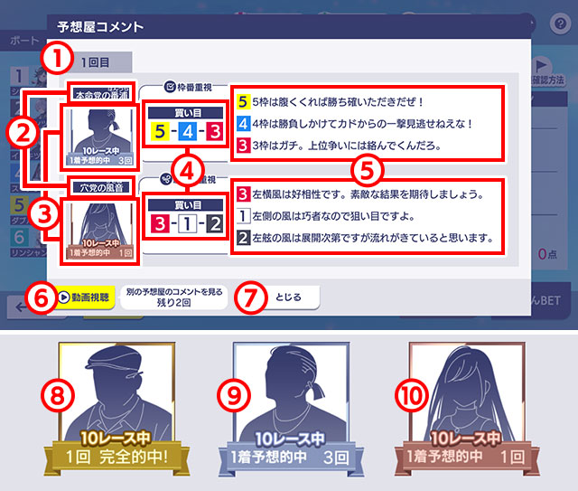- 動画を視聴することで予想屋のコメントが見られます。
