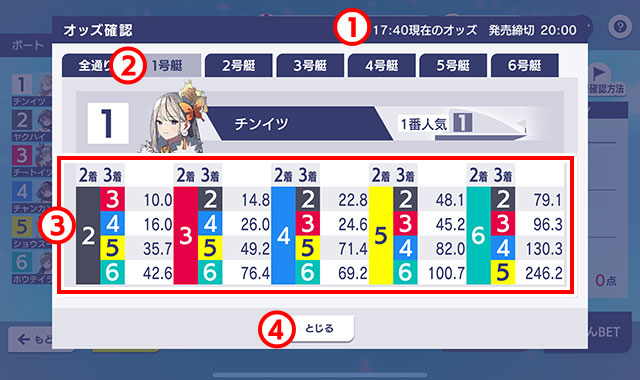 - 各キャラクターの枠番や速さなどの情報について、出走表画面と同じ内容が表示されます。