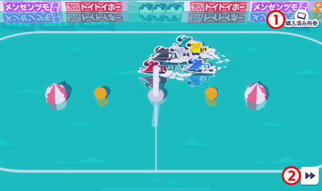 ランダムに選ばれた6体のキャラクターがボートに乗ってレース場を一周します。