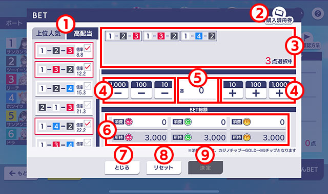 - 上位人気と高配当を切り替えられます。上位人気か高配当を選択して、ベットしたい3連単の組み合わせにチェックを入れるとベットできるようになります。