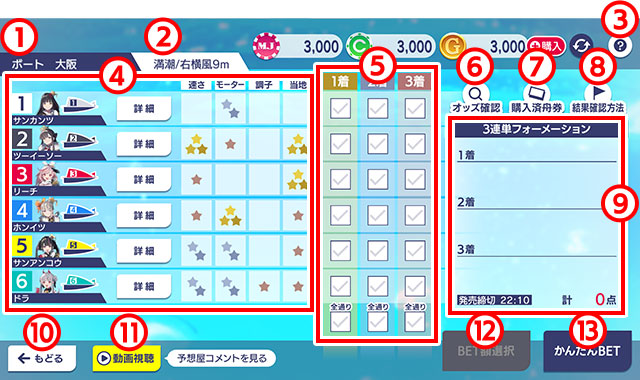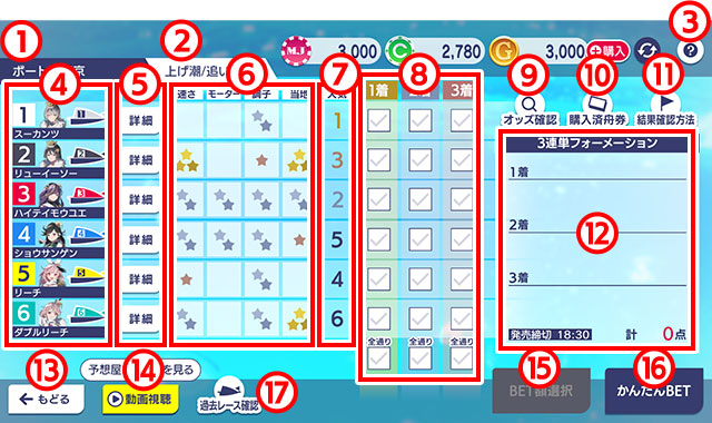 このレースでは3連単(1着・2着・3着の順番)を予想して舟券を購入します。