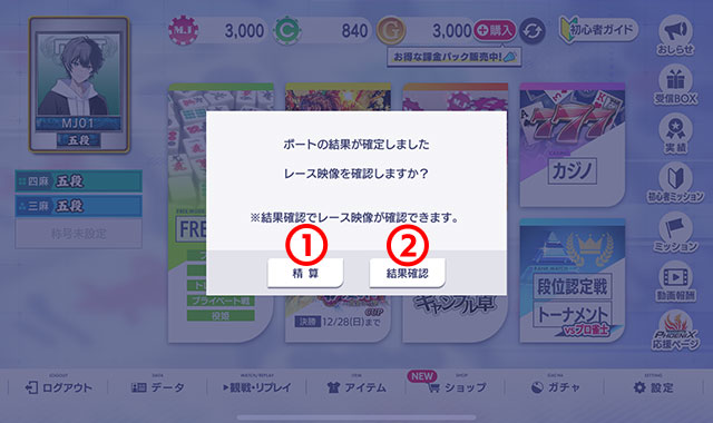 - レースの映像を確認せず、結果のみが表示されて精算が行われます。