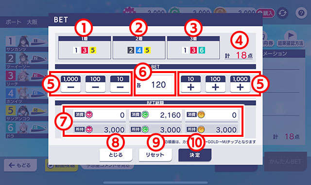 - 各キャラクターの枠番です。枠番の色はボートの色と連動しています。