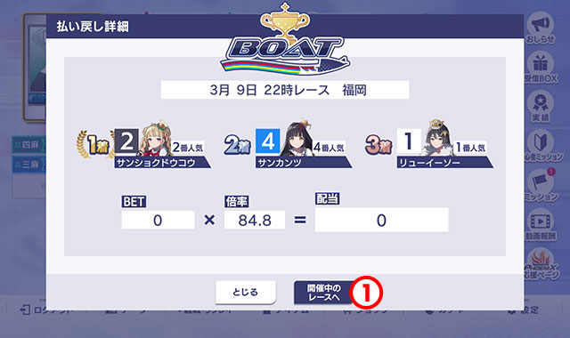 - ボートの結果確認方法が表示されます。