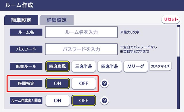 ルーム作成時に「座順指定」をONにすると、対局時のプレイヤーの座順(東・南・西・北)を事前に決めることができます。