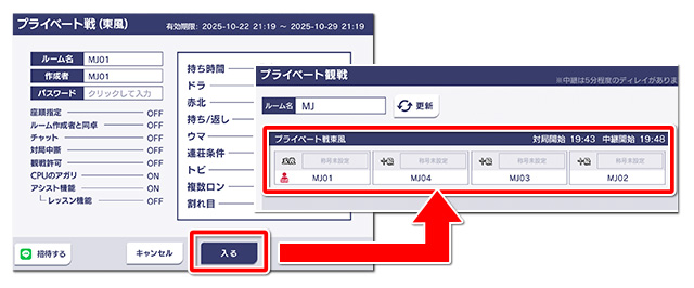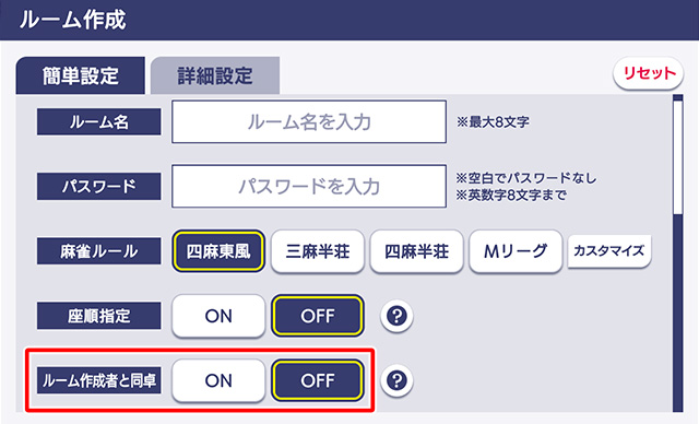ルーム作成時に「ルーム作成者と同卓」をONにすると、ルームを作成したプレイヤーを含む卓のみがマッチング成立となる機能です。