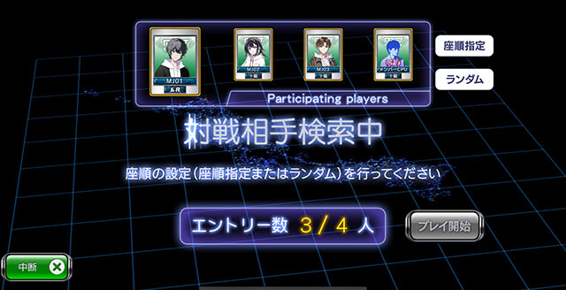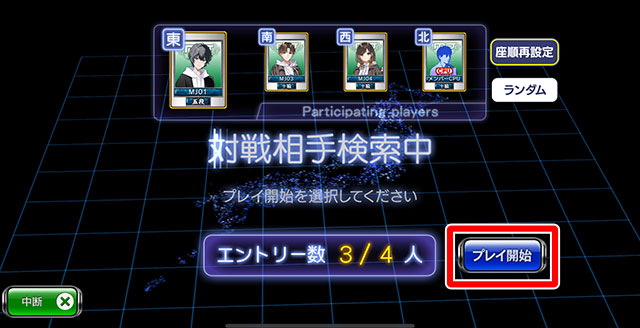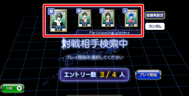 マッチング画面で、ホスト(一番左)のプレイヤーが座順(東南西北)を指定でき、プレイ開始ボタンを押すことで対局が開始できます。