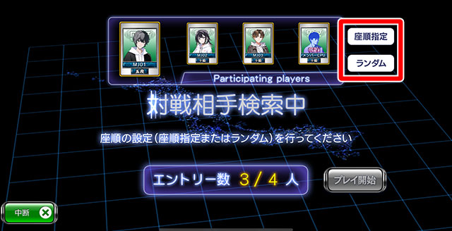 ※「座順指定」または「ランダム」のいずれかを選択しないと、対局を開始することはできません。